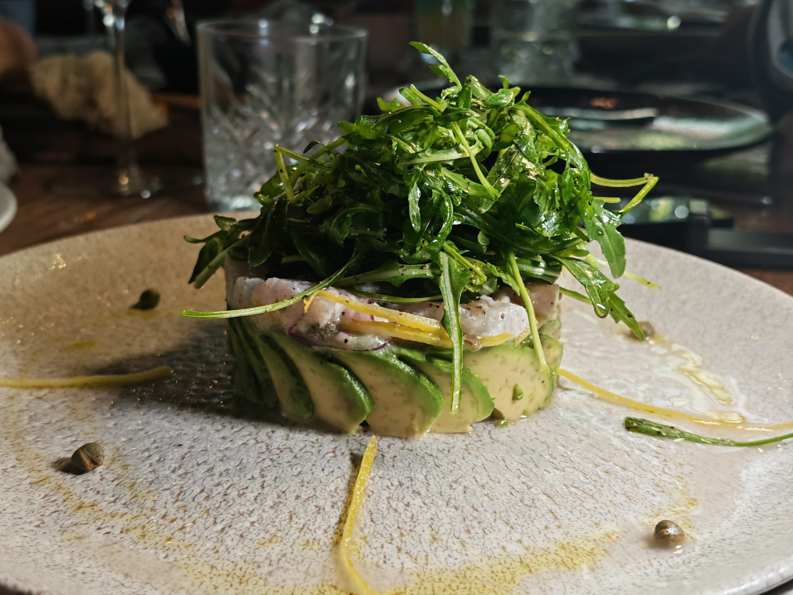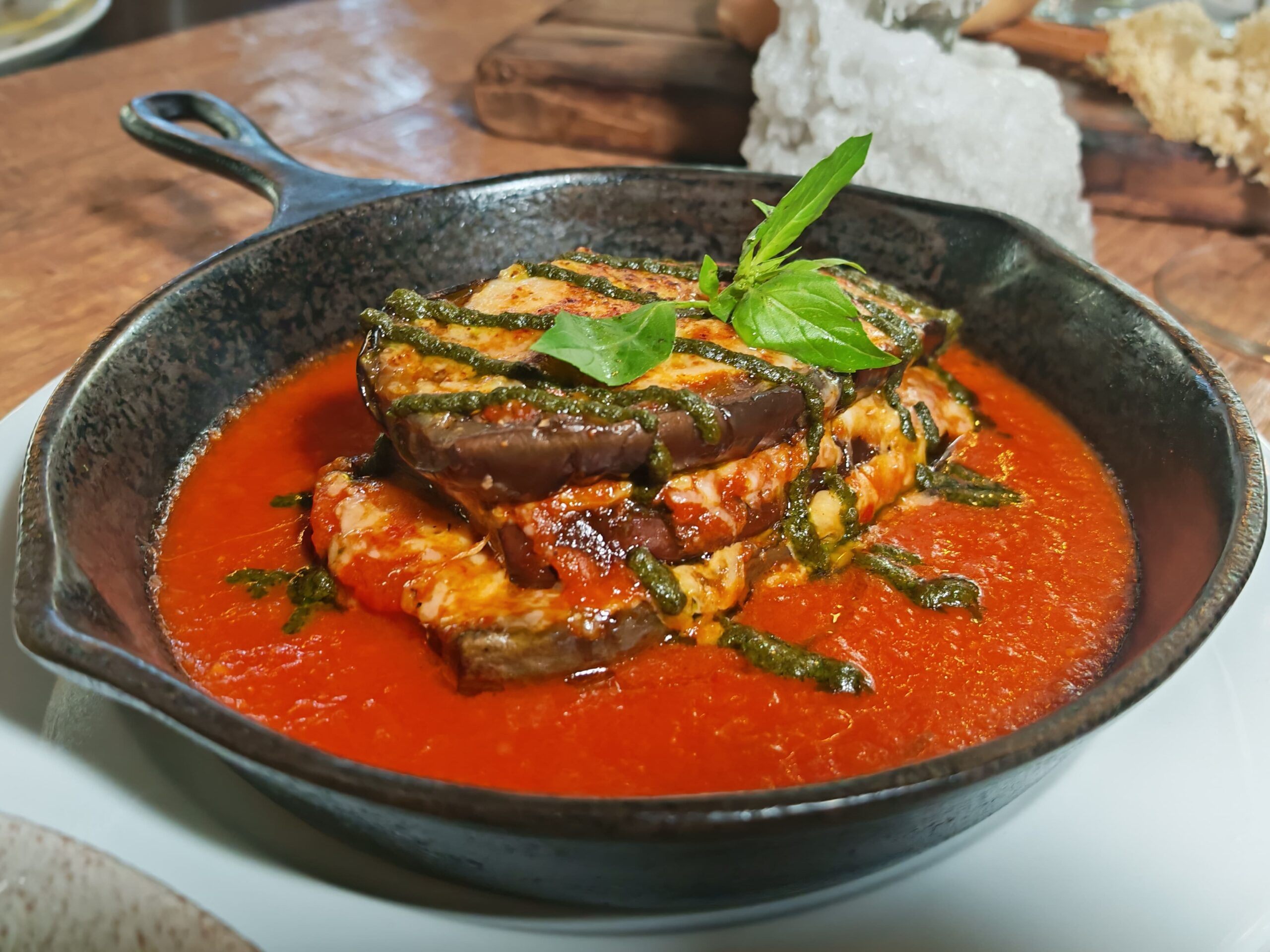La experiencia arrancó con tres entradas que marcan el compás. La Ensalada de Pera, con hojas verdes, quesos de carácter y frutos secos, refresca el ánimo y despierta el apetito con elegancia. El tartar de Pesca del Día (robalo, en esta ocasión) es un susurro marino que llega limpio y preciso al paladar. Y la Berenjena Napolitana, bien ejecutada, confirma que lo sencillo, cuando se hace con oficio, roza lo sublime.